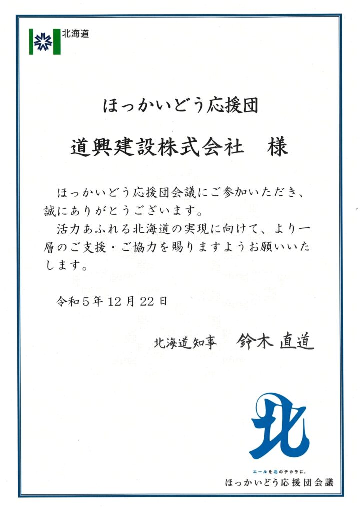 活力あふれる北海道の実現を目的とした「ほっかいどう応援団会議」に参加しています。北海道全体の価値向上と持続可能な発展を目指し、地域社会の一員としてより一層の支援と協力を行ってまいります。