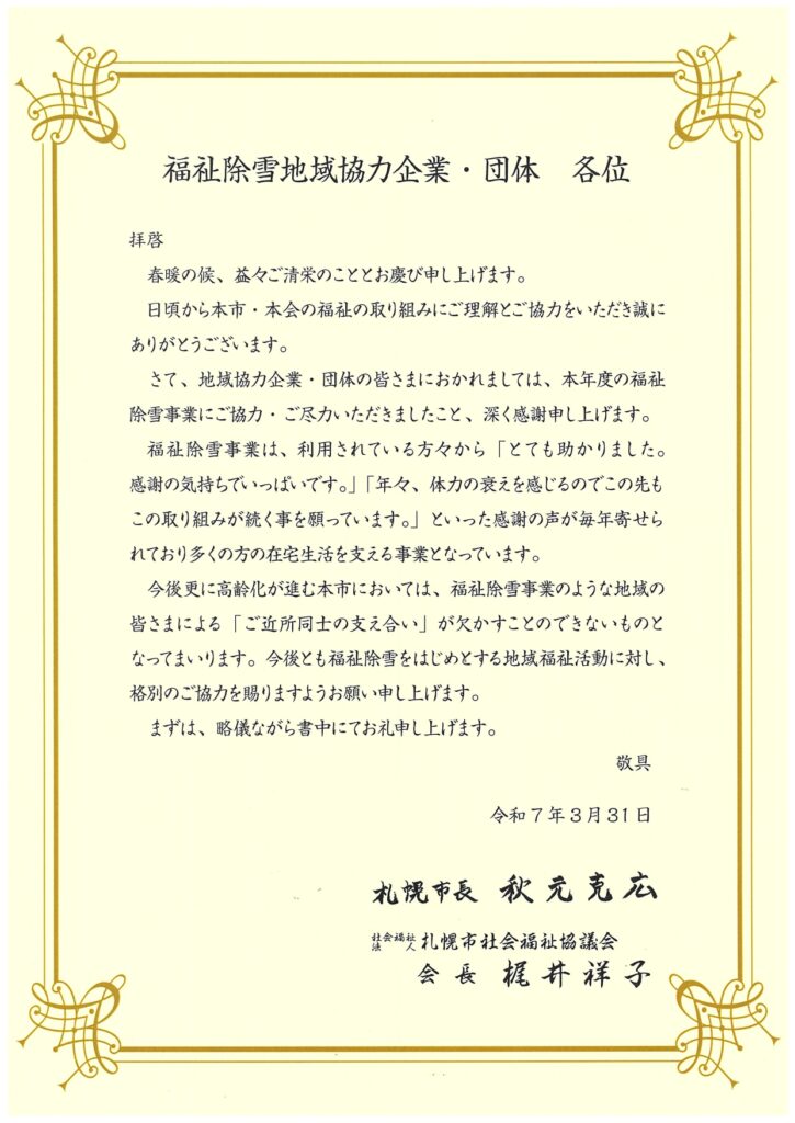 主に一戸建て住宅にお住いの高齢の方や障がいのある方が、通院や買い物などの外出時に支障となる、道路に面した出入り口部分と玄関先までの通路部分(敷地内)の雪を地域の協力員が除雪する札幌市の事業です。
