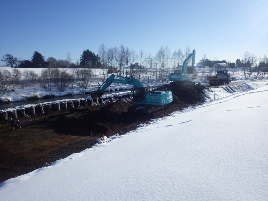 本工事は、千歳川河川整備計画に基づき、漁川・旧夕張川の河道掘削及び漁川上流築堤の堤防盛土を行うものです。