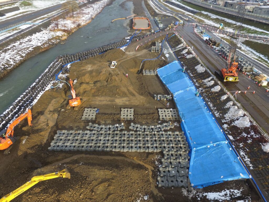 本工事は、豊平川河川整備計画に基づき、低水路の河床洗掘対策として既設護岸の根継ぎ護岸及び多自然型護岸工(帯工)を行うものです。