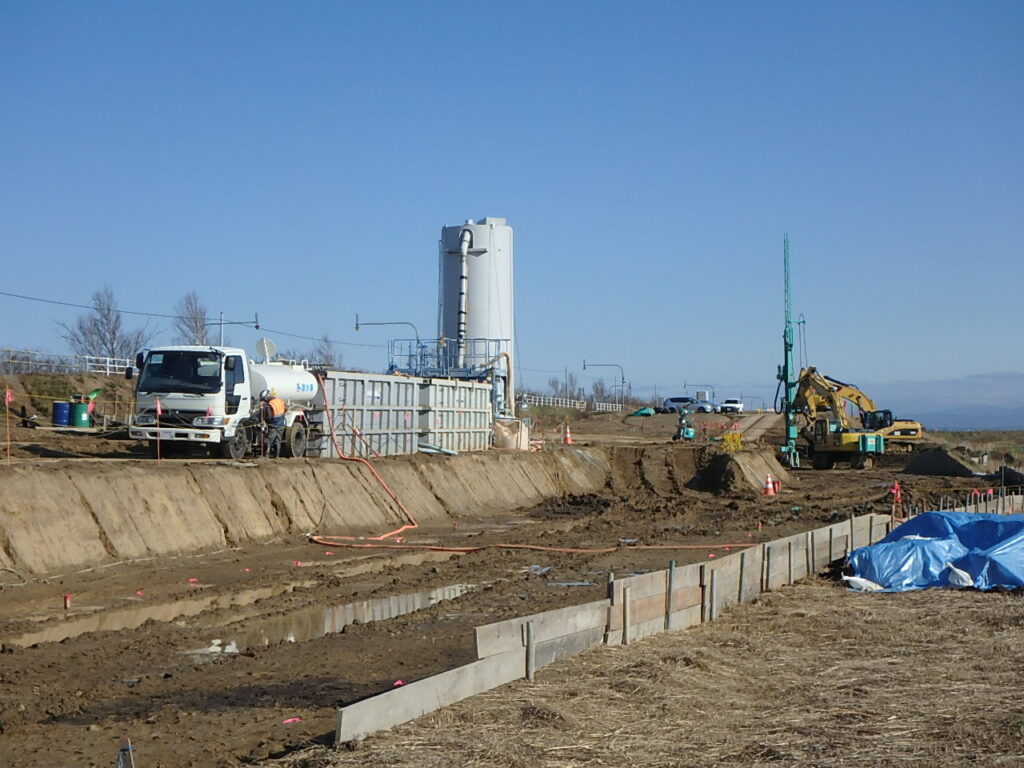 本工事は、千歳川河川整備計画に基づき、堤防整備に伴い移設となる道道栗山北広島線の地盤改良を実施するものです。